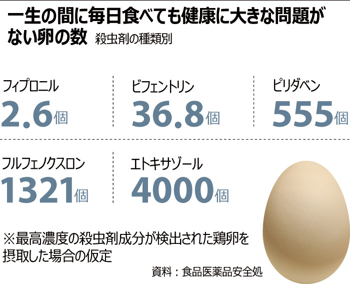農林畜産食品部(省に相当)と食品医薬品安全処(省庁の1つ)は21日、「殺虫剤成分が検出された鶏卵に関する追跡調査・衛生評価結果」を発表、「殺虫剤成分『フィプロニル』に最高濃度(0.0763㎎/㎏)で汚染された鶏卵を毎日2.6個ずつ一生食べ続けても(慢性毒性)安全だ」と述べた。