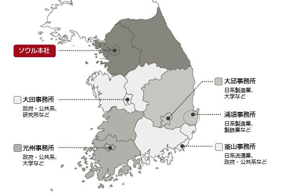 約40年間にわたって、政府・公共系をはじめ韓国ローカル企業におけるビジネスで培った、日系企業のお客様をご支援します。ソウル本社のみならず地方においても、5ヶ所(大田、大邱、浦項、釜山、光州)に事務所を設置し、ソリューションからデスクトップサービスまで、お客様の近くで強力にサポートします。