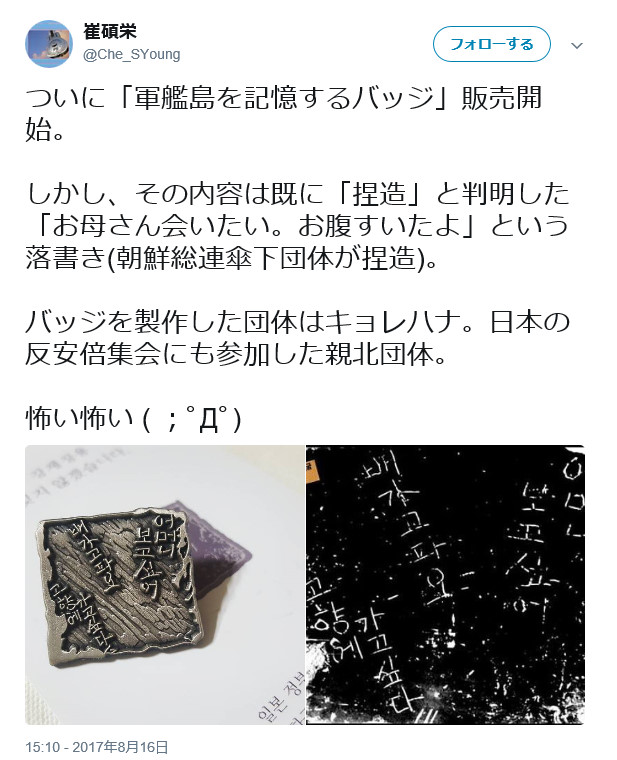 しかし、その内容は既に「捏造」と判明した「お母さん会いたい。お腹すいたよ」という落書き(朝鮮総連傘下団体が捏造)。