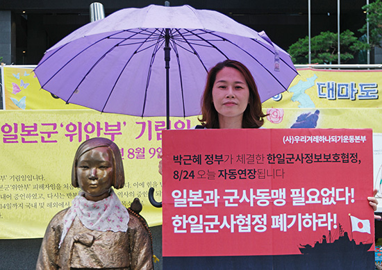 서울에서는 일본대사관 앞 소녀상과 국회, 외교부, 국방부 등에서 그리고 대전과 울산, 밀양, 창원, 마산, 부산 등 전국 40여 곳에서 “일본과 군사동맹 필요 없다. 한일군사협정 폐기하라”는 피켓을 들고 1인 시위가 진행됐다.