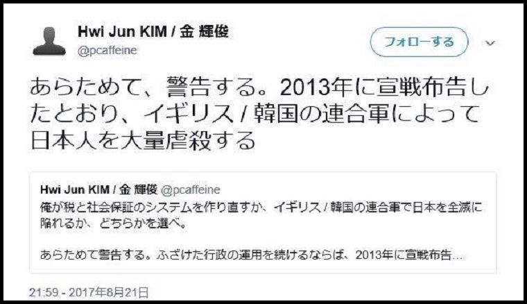 あなたの発言は日本だと脅迫罪で逮捕されますよ。>>2