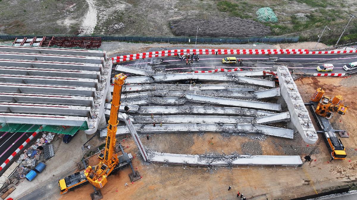 警察と消防はクレーンが橋脚の上に載せる床版を移動させている途中でワイヤーが切れて事故が発生したと推定している。