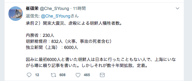 尚、民団によると関東大震災の前年、日本に在住していた朝鮮人は5万9722人でしたが、震災が起きた大正12年末には8万415人にまで増えている。虐殺されたハズなのに、朝鮮人が2万人以上も日本に押し寄せるってどう思いますか?とりあえずマジで虐殺されたら増えるのやめてくれ。怖いから(笑)