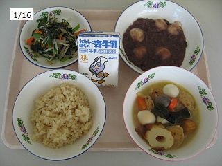 日本のある地方の小正月に食べる伝統的な郷土料理、まゆ玉ぜんざい のメニューがある学校給食- 287