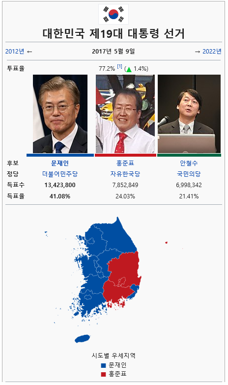 그 결과 조선 우익의 후보 홍준표는 지지기반인 대구시, 경상북도에서만 압도적으로 이기고 나머지에서는 완패했다. 세대별로 보면 60대 이상의 지지가 압도적이다. 하지만 2위를 했다고 다시 자기들끼리 자화자찬하는것이 조선 우익의 현실이다. 1위인 文에게 압도적으로 패배한 2위지만. ILBE民들은 여전히 60%는 文의 지지자가 아니라고 하지만 그 60%는 文보다 조선의 우익세력을 더 싫어한다. 그래서 지금 그렇게 높은 지지율이 가능하다.