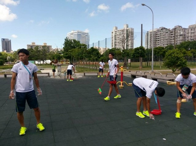 8月29日、選手村が置かれる新北市林口区地域のFacebookグループ「林口大家族」に参加するユーザが投稿した写真には、「JAPAN」のロゴつきTシャツを着た日本選手たちが、ほうきとちり取りを手に、公園を清掃している様子が収められていた。