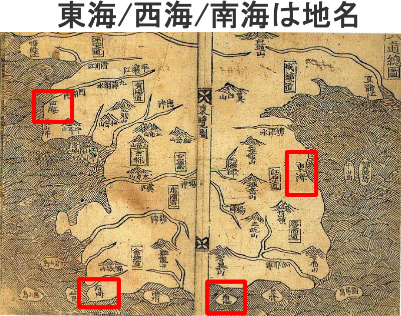 陸地に「東海」、「南海」、「西海」と書いてあるな。