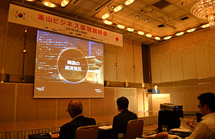 会ではその後、KOTRAや釜山市の担当者が、韓国や釜山市の投資環境や、投資可能な10のプロジェクトの概況について説明。また、釜山港の開発や発展戦略、釜山市中心部の水辺エリアで進められる開発計画「釜山エコデルタシティ」の概況説明や今後の計画、最新の物流ビジネスモデルなどについて解説を行った。会場に集まった聴講者らは皆、それぞれの担当者らによる話を興味深そうに聞き入っており、その後に行われたネットワーキング晩餐会も含めて、会は盛況のうちに幕を閉じた。