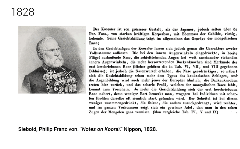 그러나 시볼드가 언급한 크기(5½피트)와 관련해서는 이 기준을 초과하는 사람이 대다수였기 때문에 그의 주장에 동의할 수 없으며, 올바른 것으로 간주할 수도 없다. 그러나 그의 결론에 대해서는 동의할 수 있다. 내가 이 나라를 여행하는 동안 볼 기회가 있었던 원주민의 상당수의 특징은 매우 고상하고 뚜렷한 표정을 지녔기 때문에 그들이 우리 패션을 따라 옷을 입었다면 유럽인으로 지나쳤을 수도 있다.- 66