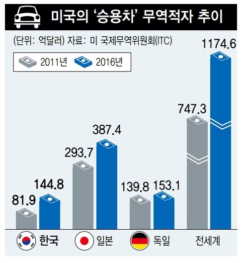 乗用車だけで見れば、韓国産の米国市場輸入額は2011年の86億ドルから2016年には160億ドルに増加した。同じ期間に日本車は300億ドルから392億ドルに増え、ドイツ車は196億ドルから219億ドル(2015年266億ドル)に増加した。米国の乗用車市場総輸入額も1231億ドルから1713億ドルに増えた。
