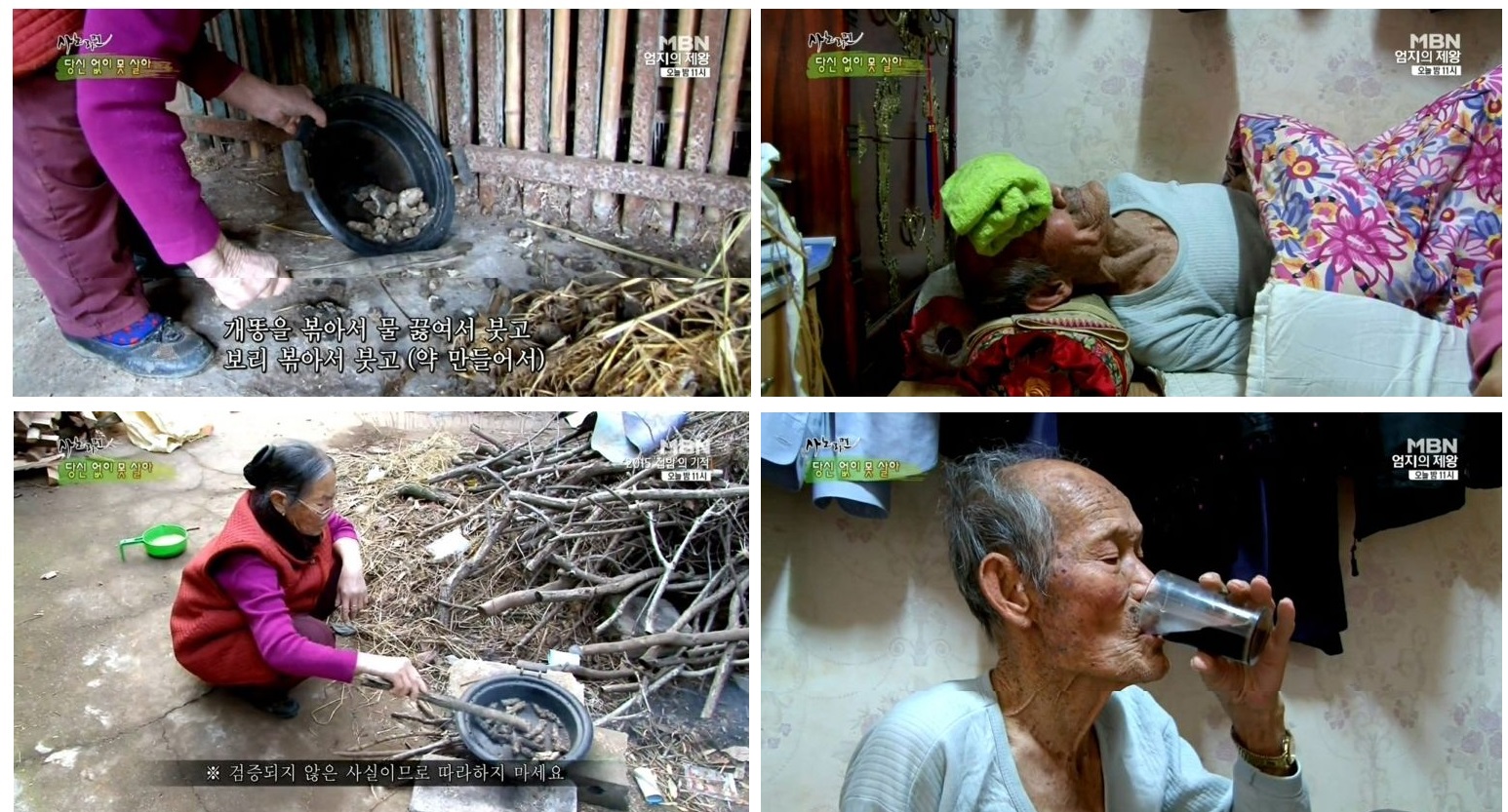 韓国の伝統特効薬(茹でた犬の糞汁)を病人のお爺さんに飲ます。