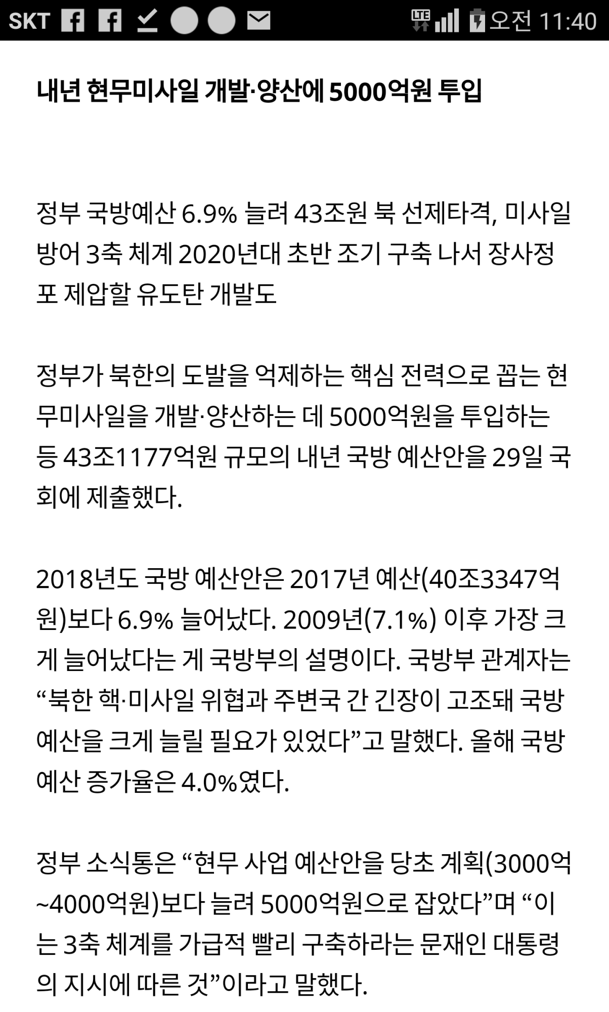 (속보) 한국군, 탄도 미사일 수량 북한보유량 3 배이상 추진