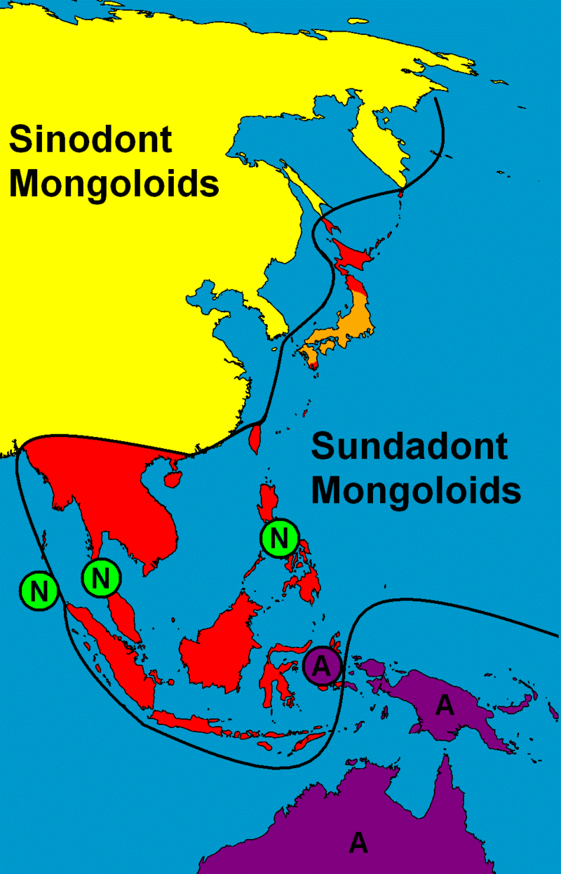일본의 조몬 (Jōmon) 족 사람들이 대만 원주민, 필리핀 인, 베트남인, 인도네시아 인, 태국인, 보르 느언 인, 라오스 인, 말레이시아 인의 남부 몽골 로이드 주민과 비슷한 Sundadont 패턴 을 유지하고 있음을 발견했다 . 하버드 대학교의 인류학 교수 인 William W. Howells가 만든지도의 휴양지는 N (Negrito) 또는 A (Wallacea, Melanesia 및 Australia의 오스트랄로이드)로 보이는 몽골 인 이외의 사람들의 잔해와 인구가 음영 처리되어 있습니다