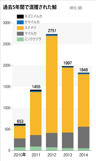 同紙によると、韓国の混獲は2014年は1849頭、13年は1997頭、
