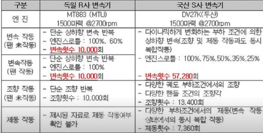 S&T重工業側は「国産変速機の初生産品は320時間(9600㎞)走行時に「欠陥があってはならない」という部分はあまりにも過酷な条件で、現在の規格書を満足する変速機は、生産不可能である」、「現在の基準を緩和した規格変更の後、耐久度試験に着手する」と主張した。現在の基準を変えなければ、開発に入ることができないということである。