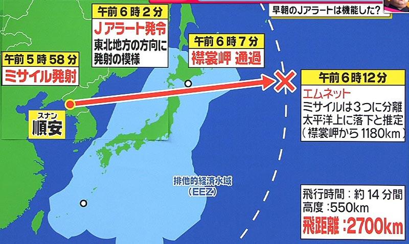 ミサイルは午前7時4分ごろから6分ごろにかけて北海道の渡島半島や襟裳岬付近の上空を通過し、発射からおよそ19分後の午前7時16分ごろ、襟裳岬の東、およそ2200キロの太平洋上に落下したと推定されるということです。