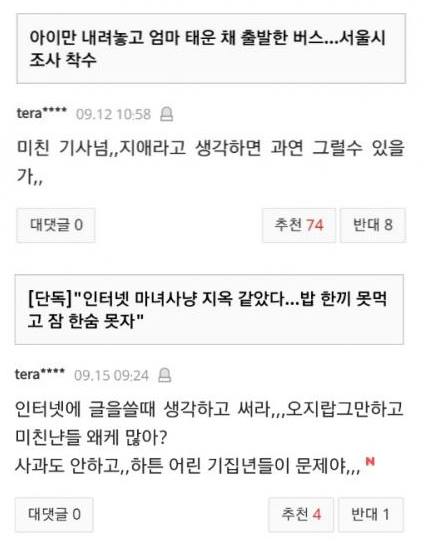 :인터넷에 코멘트를 작성할때 충분히 검토하고 작성하십시오. 자신과 상관없는 일에 참견하는 미친 녀석들이 왜 이렇게 많습니까? 버스기사에게 사죄도 하지 않고. 하여튼 어린 계집년들이 문제다.まあ、朝鮮人でまともな事を言う奴は希だから別に驚かない。