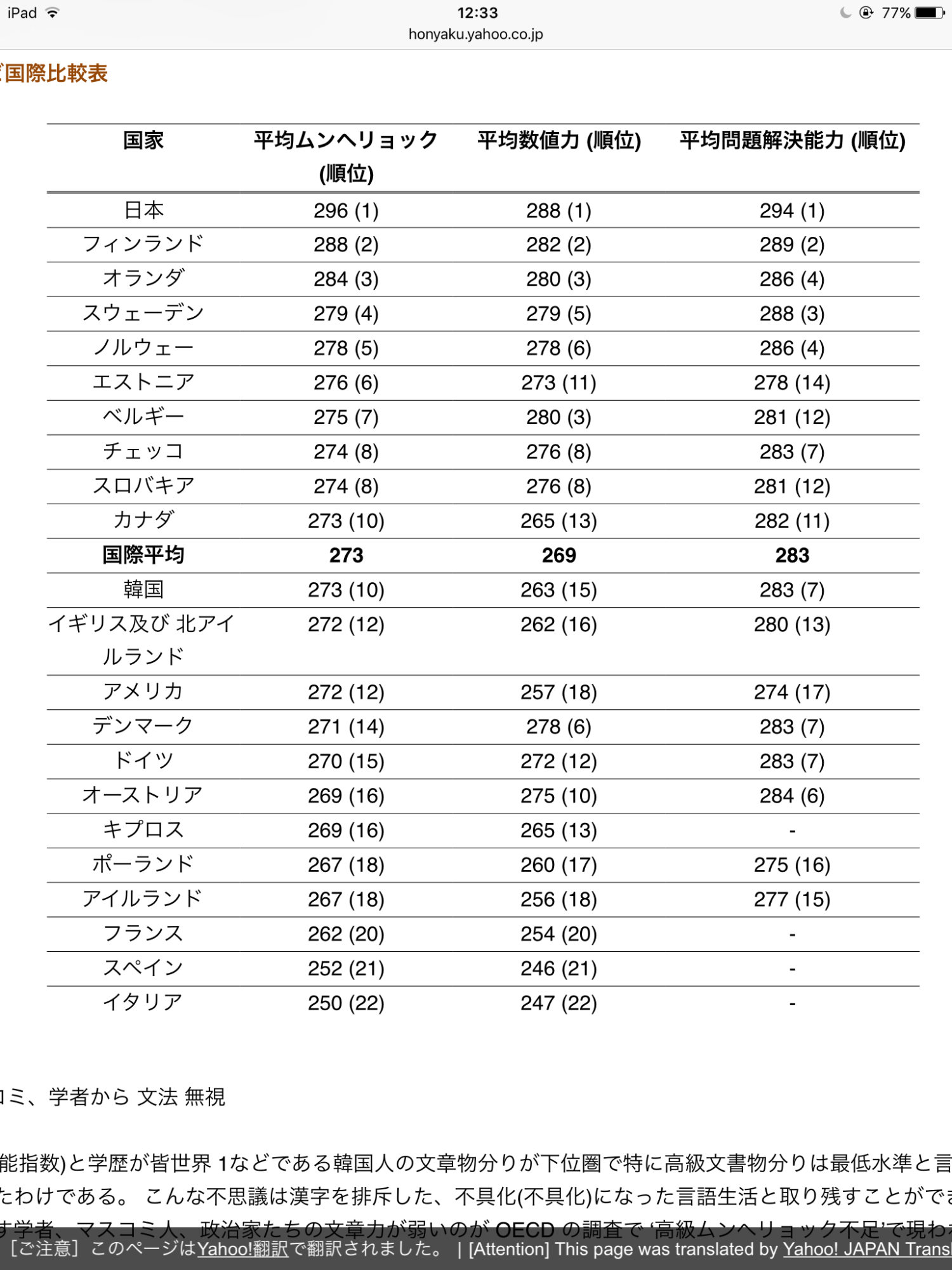 国民平均IQ(知能指数)と学歴が全世界1位の韓国人の文章理解力が下位圏で特に高度文書理解力は最低水準という点が権威ある調査で確認されたわけだ。この不思議は漢字を排斥した不具化された言語生活と無関係ではないだろう。特に韓国語で暮らす学者、ジャーナリスト、政治家たちの文章力が弱いのがOECD調査で‘高級読解力不足’で明らかになったようだ。日本人はあまり「自分は優れている」とか言わないよ。