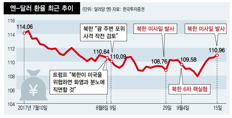 18日の国際為替市場の推移を見ると、円の価値はむしろ強気を見せた。北朝鮮が6回目の核実験を行った4日、円はドル当たり0.61%下落(円高)した。北朝鮮のミサイルが日本上空を通過した15日にも反射的に円高を示した後、地政学的危機が拡散しないという見方によって元に戻った。