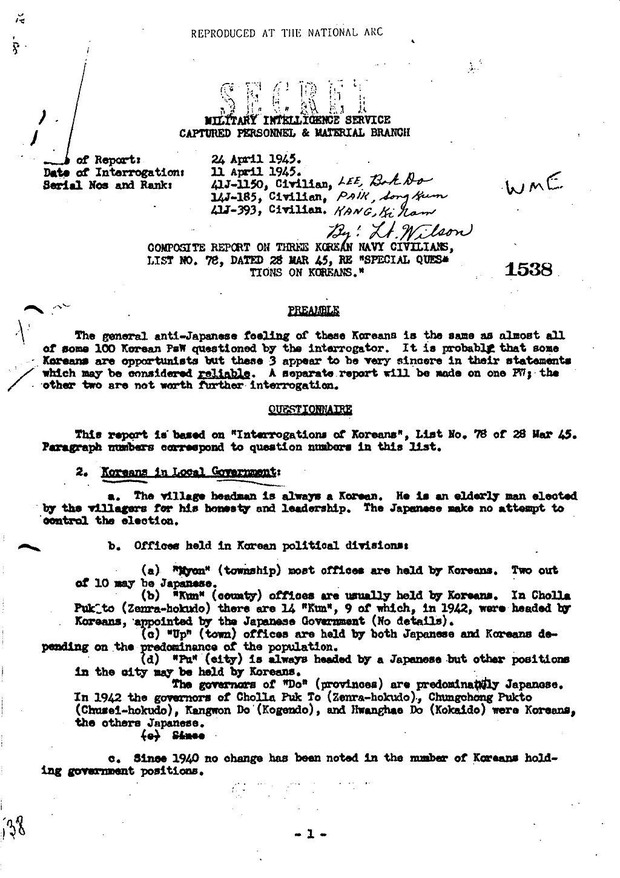 上の画像は、1945年連合国軍事情報局で、日帝民間人軍属として活動をしていた朝鮮人捕虜3人を尋問した記録。