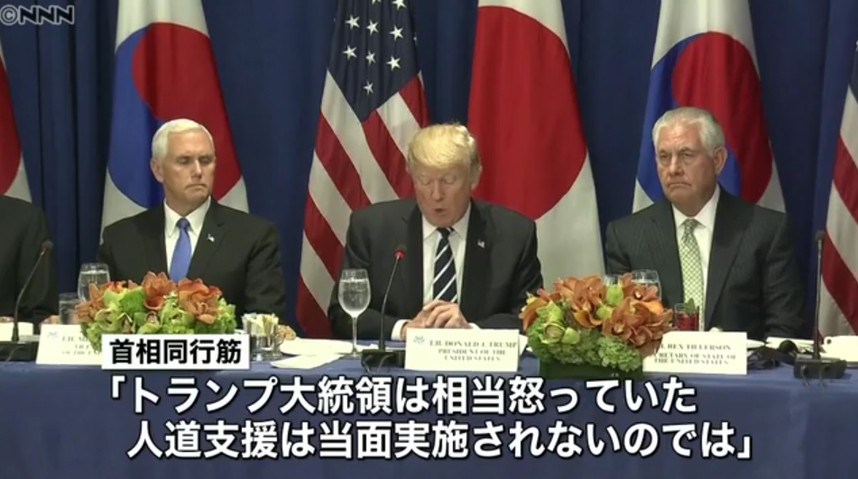 アメリカ・ニューヨークを訪れている安倍首相は、トランプ大統領、韓国の文在寅大統領と3人で会談した。日米両首脳は文大統領に対して、北朝鮮への人道支援に強い難色を示した。