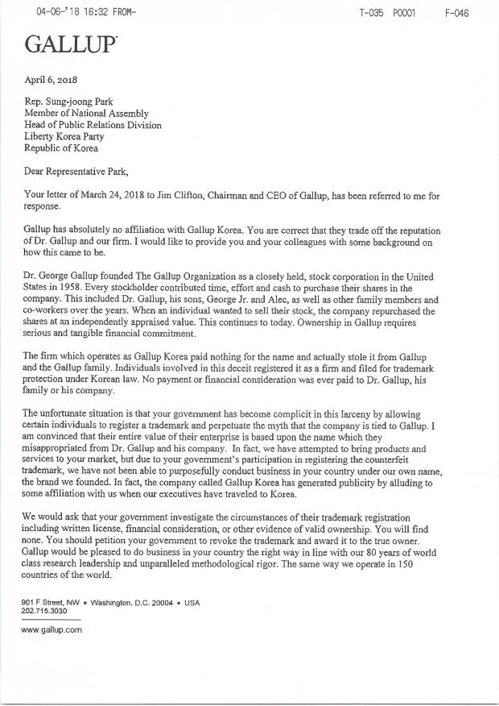 洪準杓代表は、記者会見で、米国ギャラップ本社とのやり取りをしたメールの内容を公開し、「韓国ギャラップと米国ギャラップは何の関係もない。韓国ギャラップが、米国ギャラップの商標を盗用している」「韓国ギャラップは、偽の世論操作機関と言わざるを得ない」と話した…(省略)