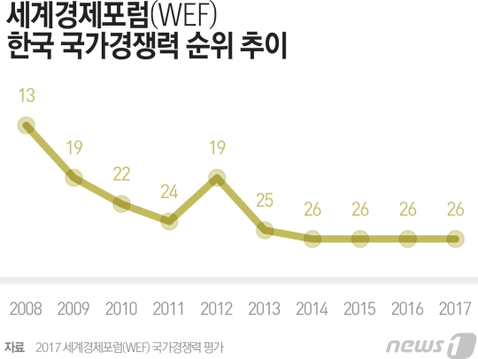 2007年11位まで上がった韓国は、その後下落が続き、2012年に19位に上昇した後、再び2013年に25位になったのに続いて、2014年から4年間26位に閉じ込められている。 26位は2004年に記録した29位以降で最も低い水準だ。(省略)