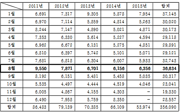 食中毒を経験した事が有る人からすると圧倒的に少ないであろう건강보험심사평가원의 의료 통계 분석결과 2011년부터 2015년 100월까지 5년간 식중독 환자수는 35만6천명이었으며, 이 가운데 8월에 3만6천명의 식중독 환자가 발생했다.