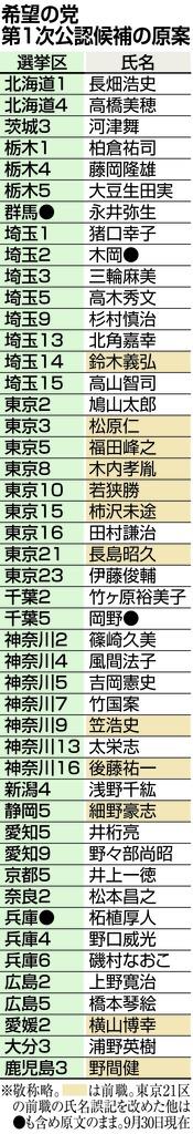 1次公認リストには、枝野氏のほか、武正公一前衆院議員の埼玉1区や初鹿明博前衆院議員が地盤とする東京16区などに候補が内定している。希望の党に加わった日本のこころ前代表の中山恭子参院議員の夫で、希望の党から出馬を目指す中山成彬元文部科学相は外れた。若狭氏の政治塾「輝照塾」に参加した鳩山邦夫元総務相の長男、鳩山太郎氏は東京2区に内定した。