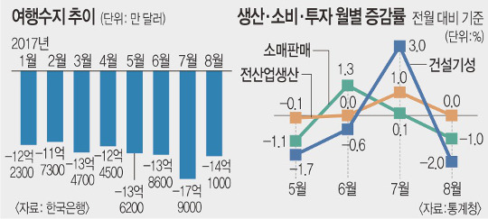각종 경제지표에서 경기 급락 신호가 감지되고 있다. 지난달 생산·소비·투자지표는 모두 뒷걸음질쳤다. 중국의 사드(THAAD·고고도미사일방어체계) 배치 보복 여파가 이어지면서 여행수지 적자가 9개월 연속 10억 달러 이상을 기록했다. 우리나라 주식과 채권을 파는 외국인도 늘었다. 정부의 올해 3% 성장 목표에 빨간불이 켜졌다는 분석이다.