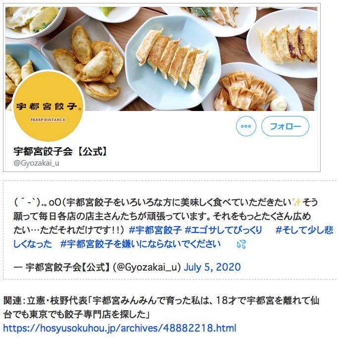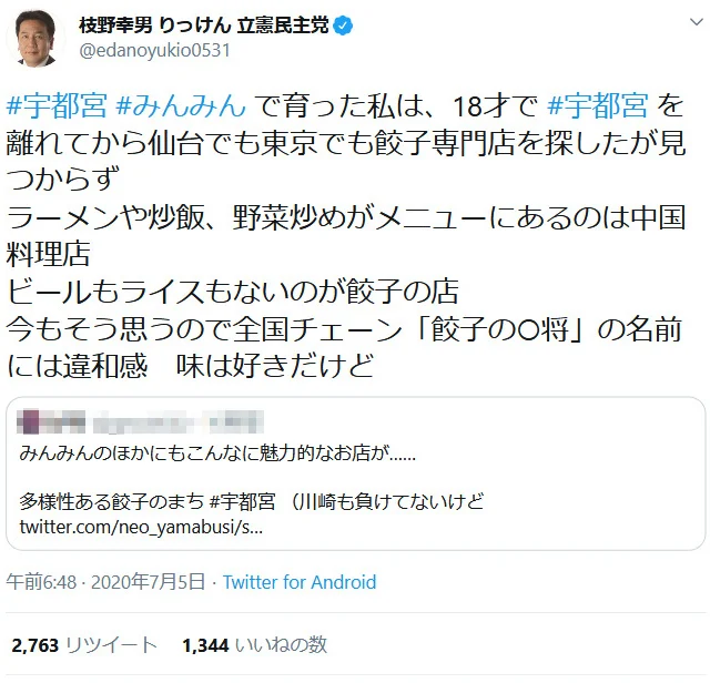 立民・枝野代表の「#宇都宮」ツイートで餃子が風評被害に?
