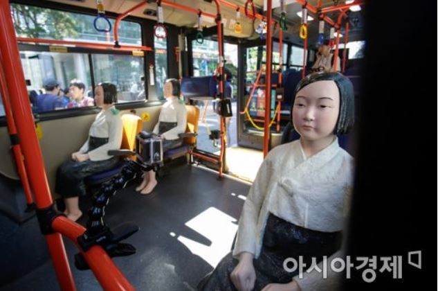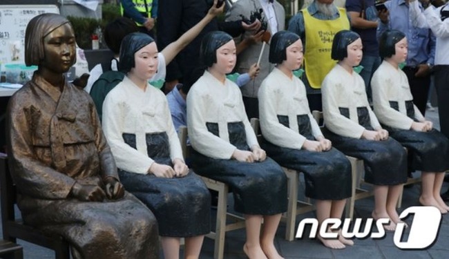この捏造人形5体をおろし、日本大使館前に並べた最低門族 by NHK 10/2