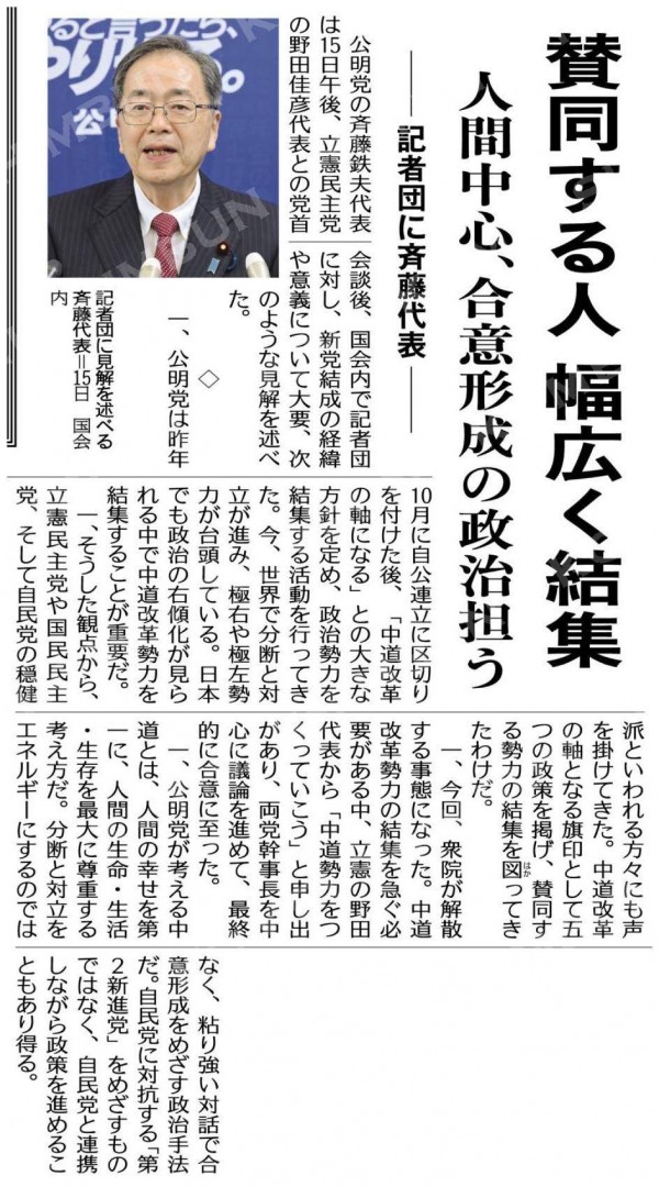 野田氏と斉藤氏は「生活者ファースト」の文言を両者合計7度連発。衆院選でのメインキャッチフレーズとなりそうだ。公明・斉藤氏「一緒に流れを」 石破前首相に中道改革で呼び掛け