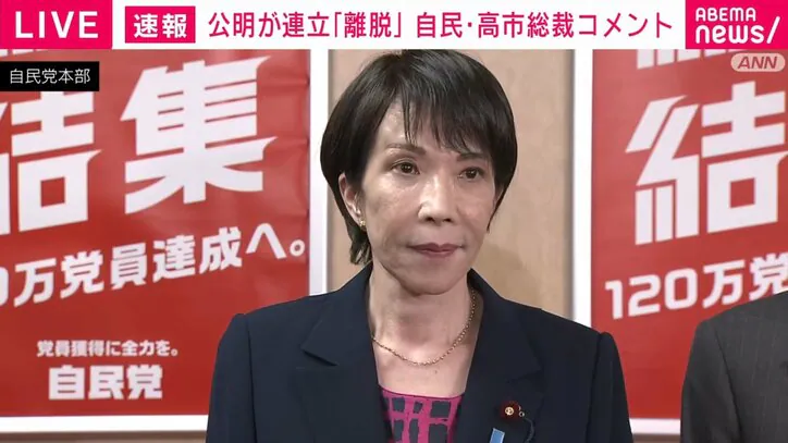 連立政権から公明党が離脱へ 自民党・高市早苗総裁「一方的に連立政権からの離脱を伝えられた」「総裁選で誰が選ばれていても同じだと言っていた」