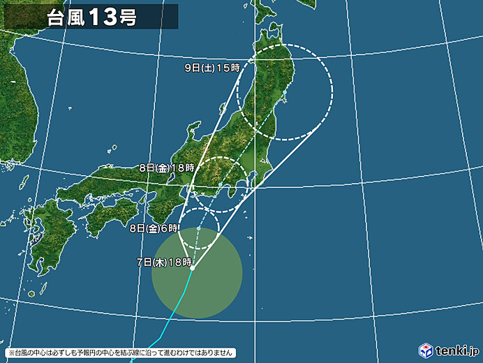 台風第13号は、7日18時現在、潮岬の南東約250kmにあって、北北東へ毎時25kmで進んでいます。中心気圧は998hPa、中心付近の最大風速は18m/sです。この台風は、8日6時には御前崎の南南西約170kmに達し、8日18時には静岡市付近に達するでしょう。台風周辺地域および進路にあたる地域は強風や大雨に、台風の進路にあたる海域はしけに警戒が必要です。https://news.yahoo.co.jp/articles/c281317e4e7995ceadf6a47f2da485d717d4f71d