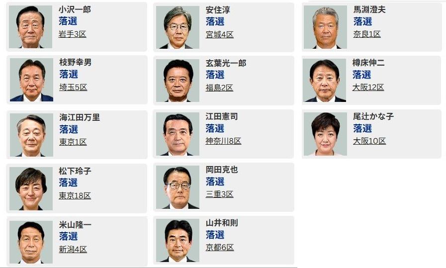 中道の公示前勢力167議席のうち、立憲出身者は144議席、公明出身者は21議席で、社民党やれいわ新選組に所属していた2人も含む。新人らを含む公明系の計28人を比例単独で擁立し全員が当選したが、立憲系の候補者は多くの小選挙区で敗北。復活を含む比例での当選者も14人にとどまった結果、安住淳共同幹事長や立憲創設者の枝野幸男氏らも復活できず、大量に落選した。
