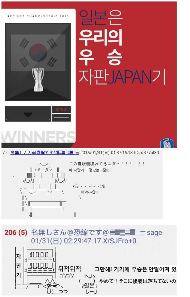 韓国で一番笑ったのは日本サッカーが勝利の自動販売機とか韓国人が言ってたのに負けた時のAA朝鮮人の考え方は、余りにも人類とかけ離れているため、