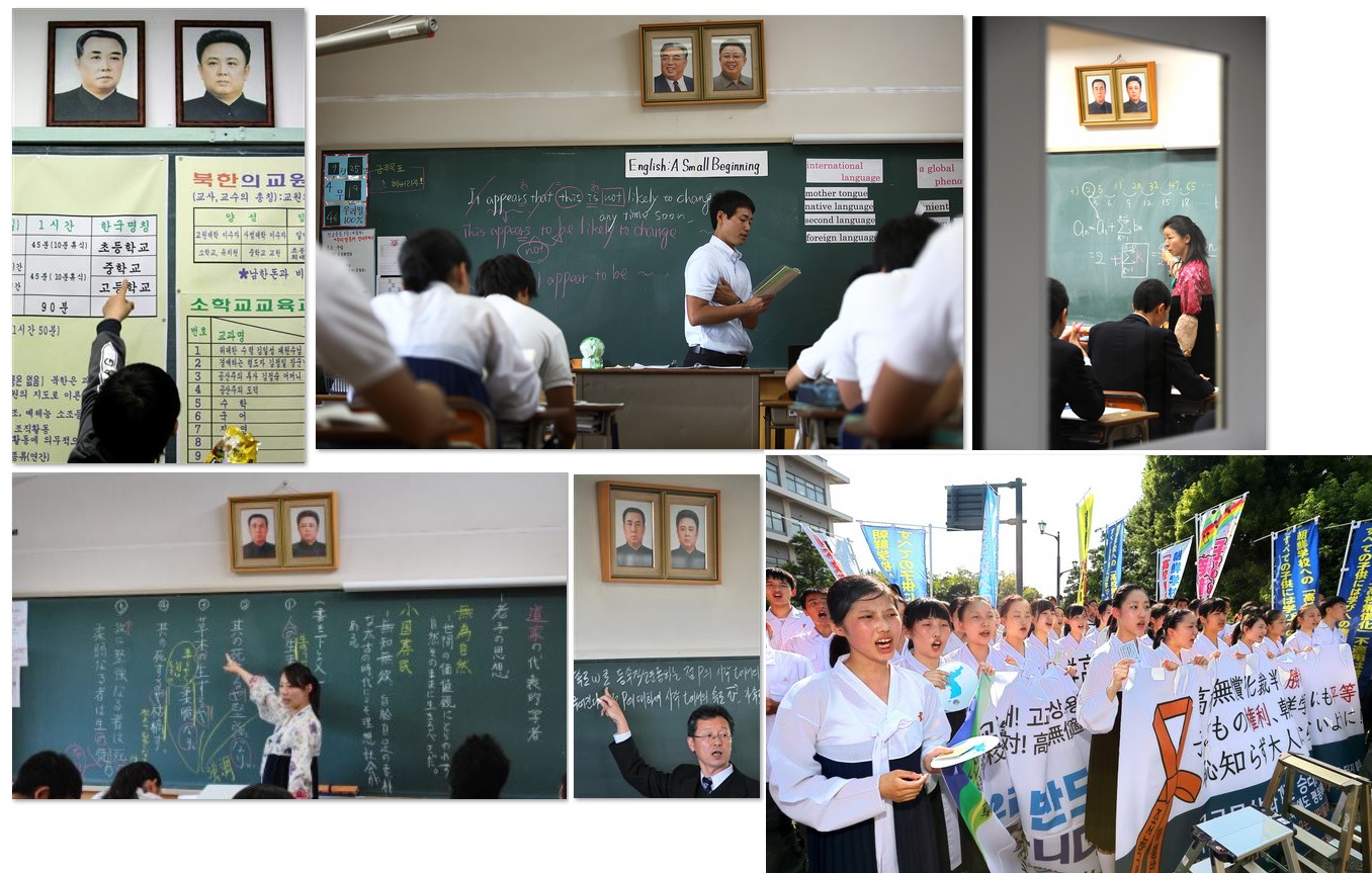 北朝鮮の金豚親子の肖像画を前にして朝鮮学校で授業を受ける