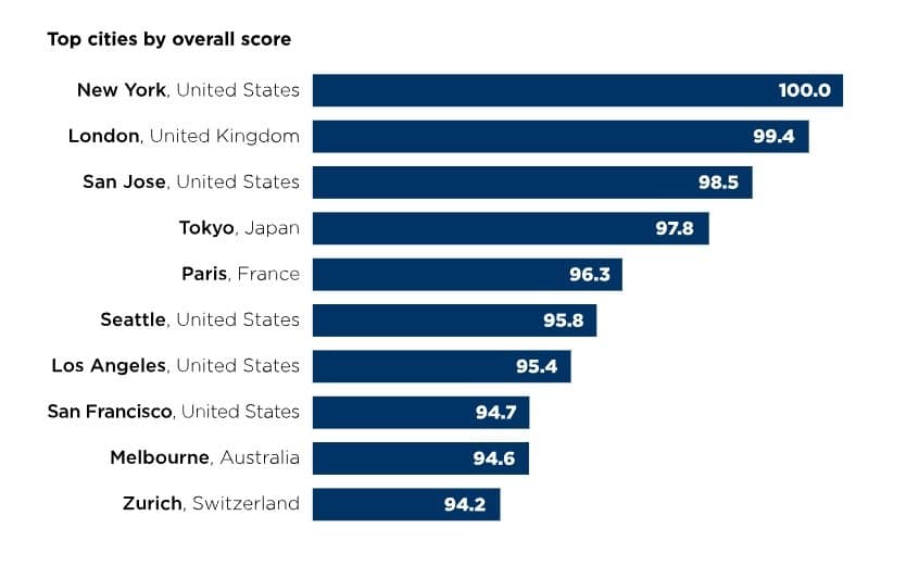 EIUは世界の60の主要都市を対象に、デジタル安全・衛生安全・インフラストラクチャ安全・個人の安全などの4つの部門にまたがるすべて49個の定性・定量指標を評価して、この指数を算出した。