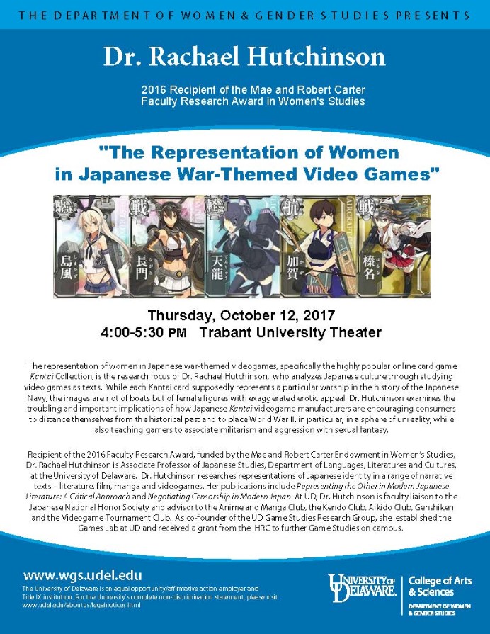 Rachael Hutchinsonは、デラウェア大学の日本研究学部の准教授です。彼女は、映画、文学、漫画、ビデオゲーム、オリエンタリズム、オクシデンタル主義、長井カフの文学における検閲問題、黒澤明の映画など、日本のアイデンティティーを表現することに関心を持っています。彼女はまた、マンガやビデオゲームの日本の歴史を表現することにも興味があります。ハッチンソン博士は、ニッポニカ記念館、日本フォーラム、ニューメディア・ジャーナル誌、ゲームと文化に論文を掲載しています。彼女の最近の出版物はLeith Mortonと共同編集されたThe Routledge Handbook of Japan Literatureです。http://www.dllc.udel.edu/the-representation-of-women-in-japanese-war-themed-videogames-oct-12-400-530-pm/
