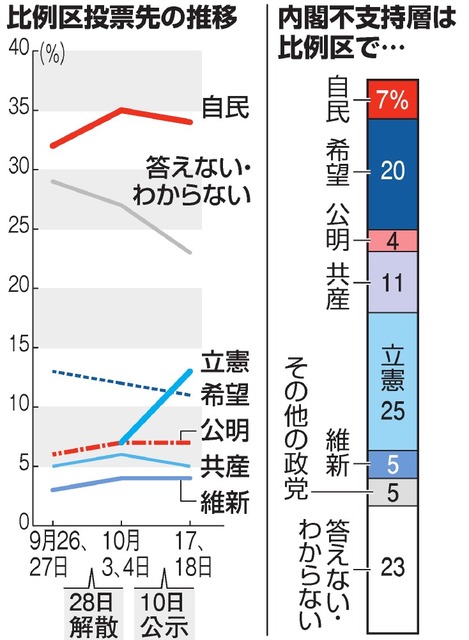 比例投票先、立憲伸び13% 希望11% 朝日世論調査