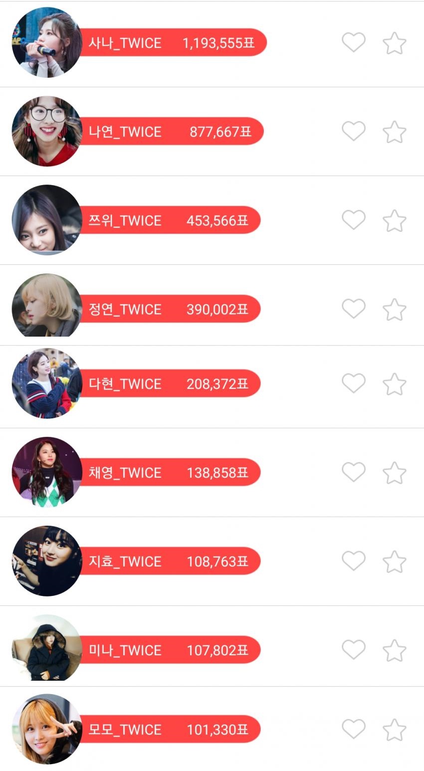 1.9일 1위 나연/2위 쯔위/3위 사나/4위 정연/5위 미나/6위 지효/7위 다현/8위 모모/9위 채영