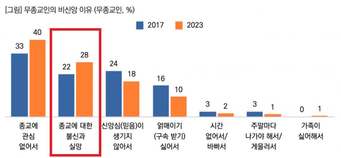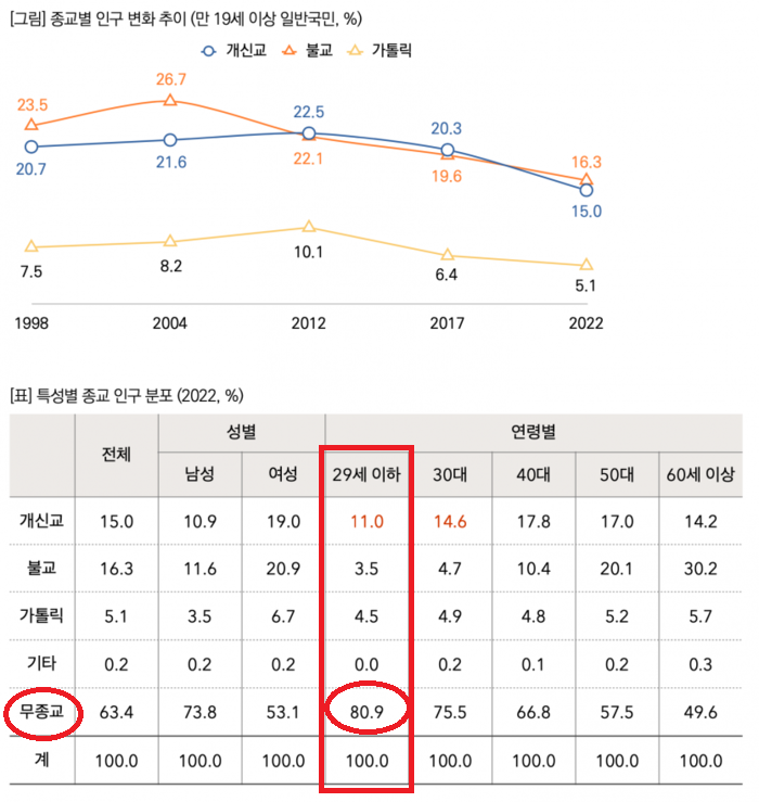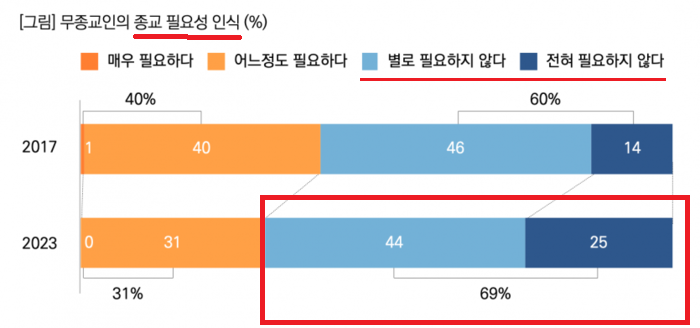 https://www.crs-news.com/27385 , 한국사회 무종교인 63%, 2017년보다 2배 늘어...20대 무종교인 80%