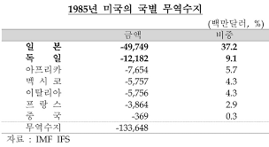 더 이상 재정적자(부자감세, 군비확대, 내수위축과 제조업도산으로 세수감수)와 무역적자(고금리로 인한 달러강세)의 확대를 견딜 수 없게 된 미국은 일본과 독일의 통화를 대상으로 달러평가절하를 위해 강제로 환율조정에 나섰다. 물론 목적은 달러평가절하(달러약세)를 통해 미국상품의 무역경쟁력을 회복함으로서 자국의 무역적자를 만회하고자 한 것이다.