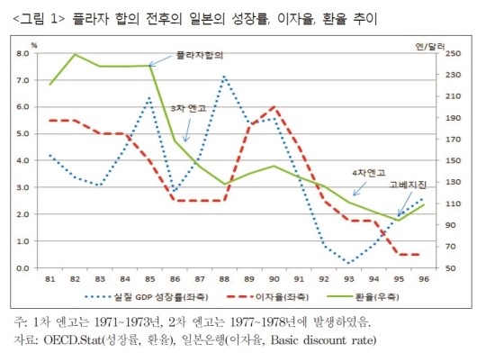 이 때 독일 마르크화는 30%절상되었고 또 엔화는 3년 만에 100% 이상 급상승했다. 매년 4~5%의 안정적인 경제성장을 하던 일본은 갑자기 닥친 엔고로 인해 해외시장에서 가격경쟁력을 상실하면서 수출이 급감하여 수출기업들이 위기에 몰리자 경기부양을 위해 금리인하와 대출완화를 단행했다.