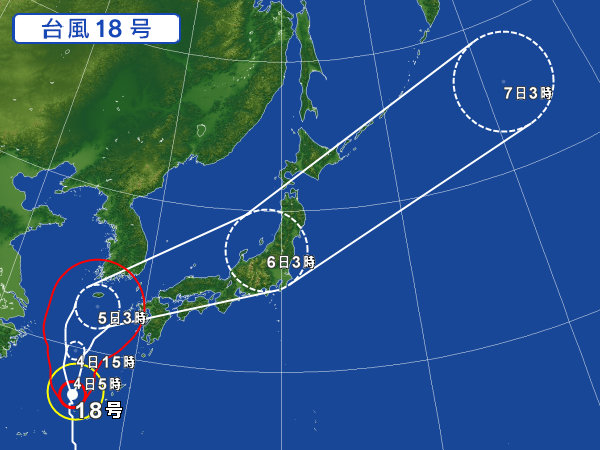 猛烈な台風18号は3日夜、沖縄県久米島地方を暴風域に巻き込みながら北北西に進んでいる。沖縄気象台では午後7時2分、沖縄本島地方に暴風、波浪、大雨、高潮の「特別警報」を発表。特に久米島を中心に甚大な被害が発生する恐れがあるとして、最大級の警戒を呼び掛けた。台風は同日、急激に発達し、中心気圧905ヘクトパスカルまで低下。沖縄に接近した台風では1959年の台風14号が宮古島で記録した908ヘクトパスカルが最も低く、県内、国内で観測史上最大級の台風襲来となった。