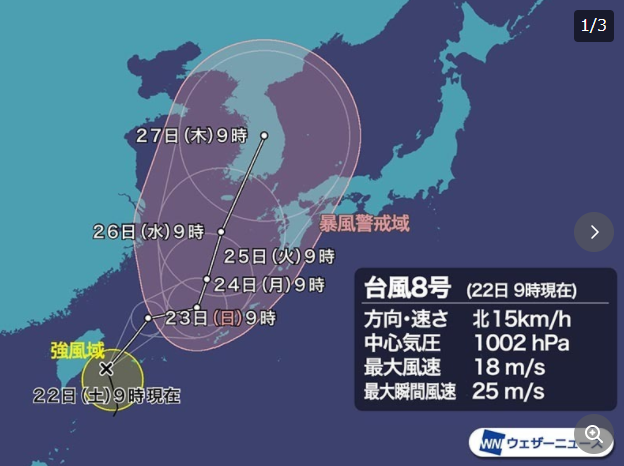 また九州・朝鮮半島方面に台風接近するな、来週の水曜日頃か。