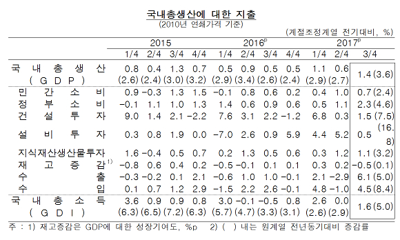 한국은행은 26일 3분기 국내총생산(GDP) 성장률(속보치)이 전기 대비 1.4%라고 발표했다. 지난해 같은 기간과 비교해서는 3.6%다.