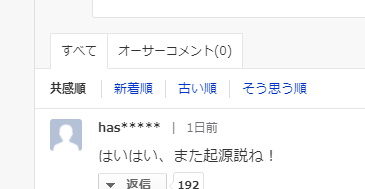 下の192は、その人のコメントの返信数「共感」と「そう思う」は違うカテゴリなのか?