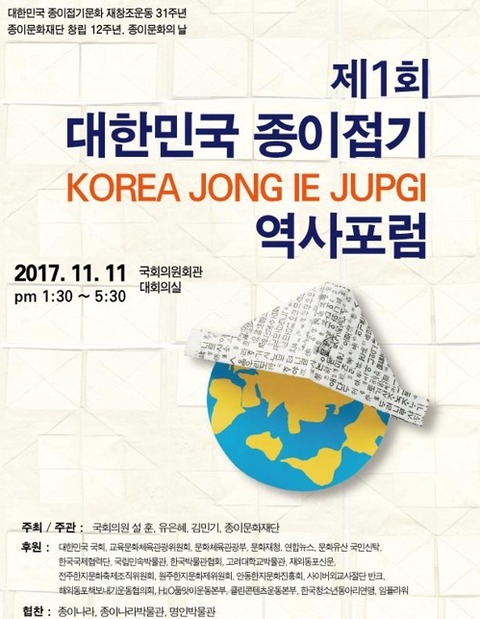 紙文化財団・世界折り紙連合(理事長ノ・ヨンヘ)は、11月11日に「紙文化の日」を迎え、国会議員会館大会議室で、共に民主党のソル・フン、ユ・ウンヘ、キム・ミンギ議員と共同で「第1回、大韓民国折り紙歴史フォーラム」を開催すると、23日明らかにした。